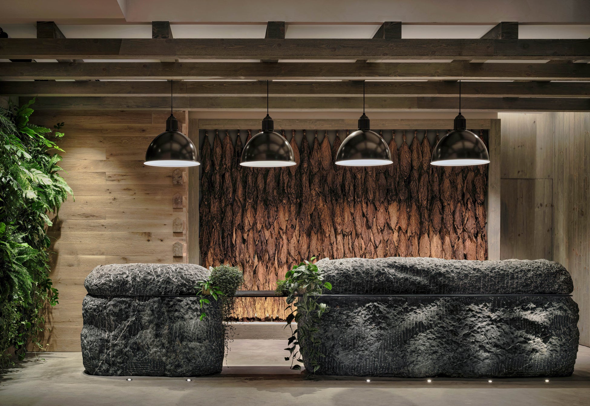 再生木材、大理石、銅など自然素材を随所に取り入れ、心地よい質感を生み出しています。「1 Hotel Tokyo」では大谷石を用いたエントランスでゲストをお迎えします。