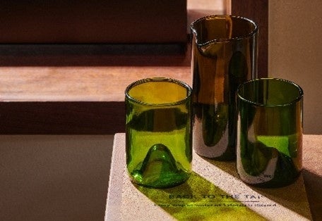 シャワーの長時間利用を抑制する砂時計の設置、ワインボトルを再利用したデザインのグラス採用など環境に配慮した取り組みを積極的に行っています。