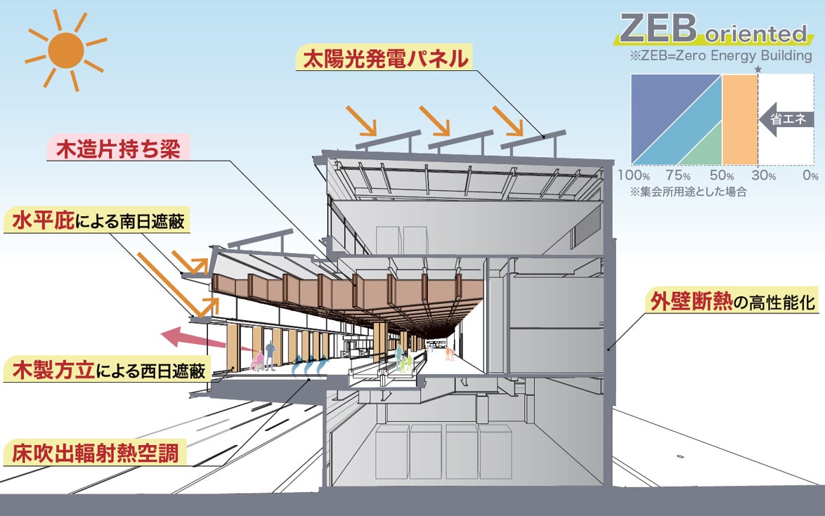 ZEBとは、Net Zero Energy Building(ネット・ゼロ・エネルギー・ビル)の略称であり、快適なターミナル施設の環境を実現しながら、建物で消費する年間の一次エネルギーの収支をゼロにすることを目指した建物のことです。省エネによって使うエネルギーを減らし、創エネによって使う分のエネルギーを作ることで、エネルギー消費量を正味(ネット)でゼロにすることができるという考え方です。まず本施設では、その前段階であるZEB orientedの認証取得を目指し、建物で消費する年間の一次エネルギーを30%以上低減することを目指します。(図参照)