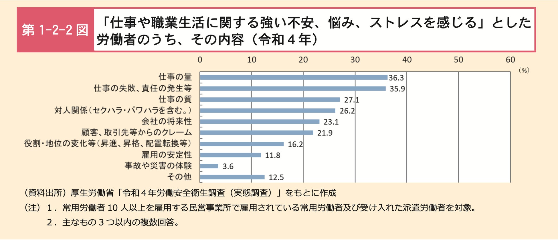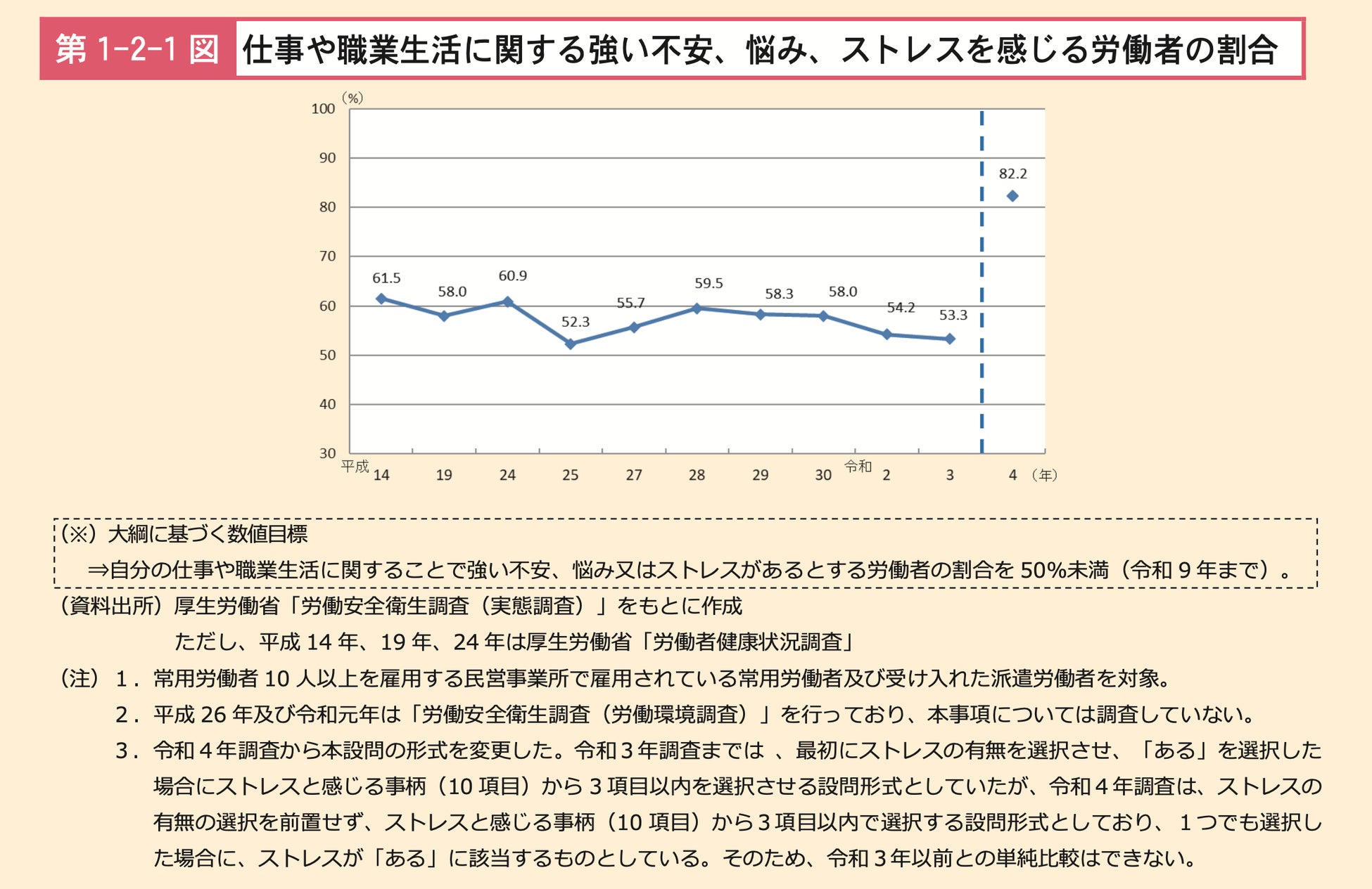 森を歩くレジャーとして日本国内で定着した森林浴。2000年代に入ってからは、健康増進の手段として注目されるようになりました。しかしコロナ禍で働き方が多様化した昨今、令和4年に厚生労働省が調査した「職場におけるメンタルヘルスケア対策の状況」によると、82.2%の労働者が、仕事や職業生活に関することで強い不安、悩み、ストレス感じているという結果が発表されました。そのストレスの内容も様々で、仕事量36.3%、仕事の失敗や責任の発生35.9%、仕事の質27.1%などが挙げられています。