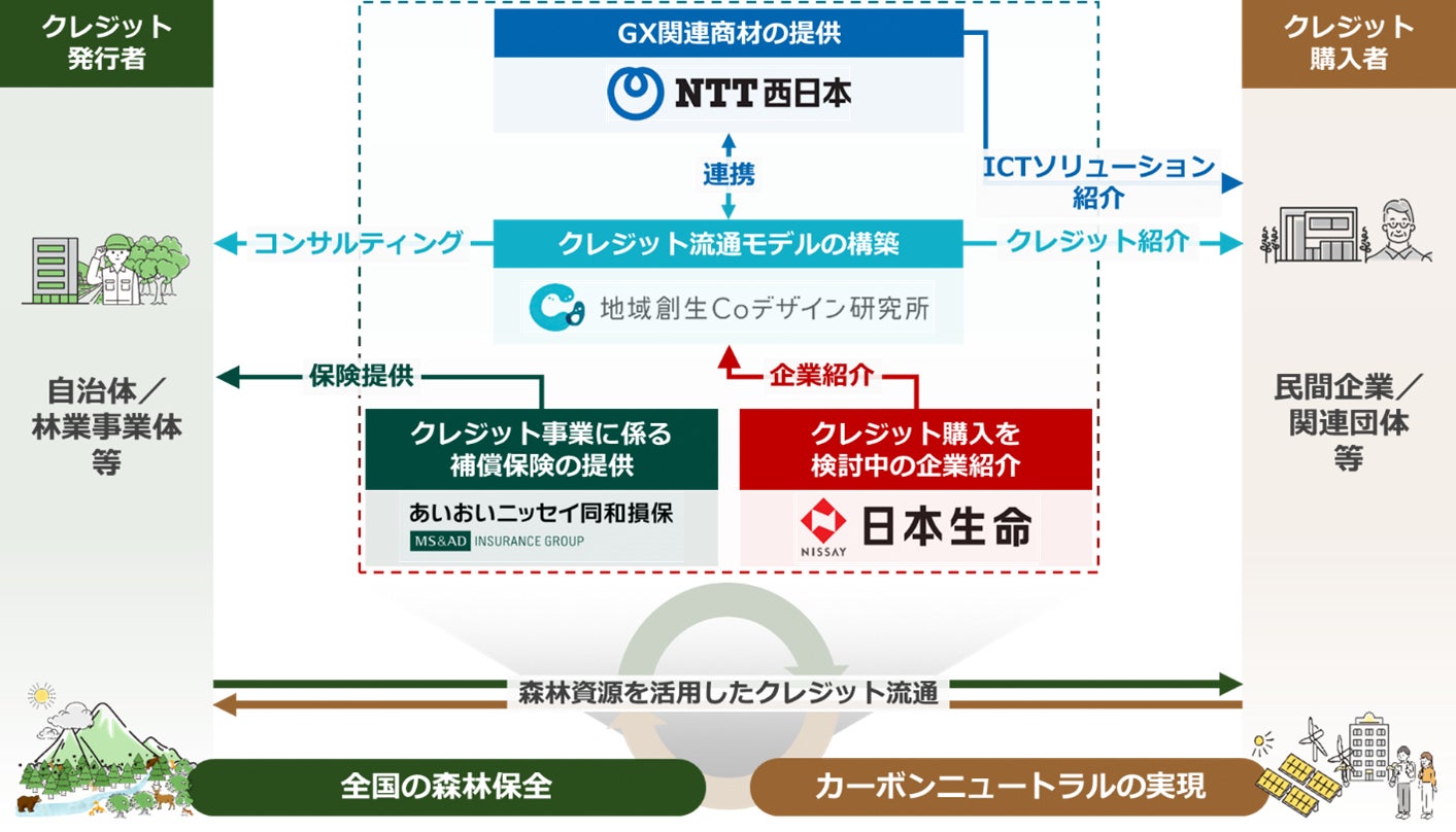 日本生命保険相互会社(代表取締役社長:清水 博、以下「日本生命」)、あいおいニッセイ同和損害保険株式会社(代表取締役社長:新納 啓介、以下「あいおいニッセイ同和損保」)、西日本電信電話株式会社(代表取締役社長:北村 亮太、以下「NTT西日本」)および株式会社地域創生Coデザイン研究所(代表取締役所長:北山 泰三、以下「地域創生Coデザイン研究所」)は、森林資源を活用したカーボン・クレジット※1の創出・流通による脱炭素社会の実現に向けた連携スキームを構築し、2024年10月1日より取り組みを開始いたします。