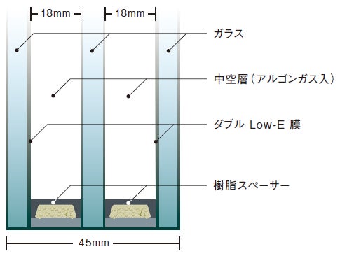 2つの中空層を18mmにアップしたアルゴンガス封入総厚45mmのダブルLow-Eトリプルガラスを採用し、熱貫流率0.99W/(㎡・K)(※5)のトップクラスの断熱性能を実現しました。