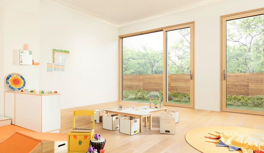 RC造などの非木造建築物に対応した専用部材を設定。耐風圧性S-5(2,400Pa)、水密性W-5(500Pa)などの性能により10~15階程度(※8)の高さの非木造建築物に使用可能です。自然や木を活かした空間に調和する素材感を活かし、集合住宅のキッズルームやゲストルームなどの共有部や居室部のリビング、また宿泊施設などへ、高い断熱性と天然木のぬくもりによる新たな付加価値を提案します。