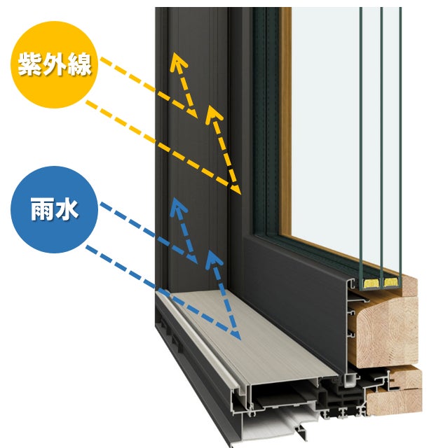 雨や紫外線の影響を受ける室外側は、アルミで被覆したアルミクラッド構造になっており、耐候性・耐水性に優れています。さらに室内側の木部の塗装は、下塗りで含浸塗装着色を用い、その上に2層のクリアコートを十分に塗布することで、木目を綺麗に見せながら、傷が付きにくく、紫外線や水分から木部を守ります。